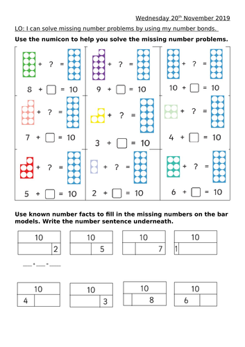 Number Bonds: Word Problems Themed Math Worksheets | Age 5-7 Number bond is addition of two parts to make the whole. Download Number Bonds: Word Problems (World Animal Day Themed) Math Worksheets This is a fantastic bundle that includes everything you need to know about number bonds using word problems across 16 in-depth pages. These are ready-to-use worksheets suitable for students aged 5-7 years old. Number Bonds Worksheets | Download Free PDFs - Cuemath Number Bonds Worksheets Number bonds worksheets help students to apply appropriate rules to identify and find the number of significant digits in whole numbers and decimals. Number bonds are missing number addition problems that all have the same sum. Number Bond Worksheets - Thousands of free math worksheets, math IQ ... Adding Dominoes. (level 1) Adding Dominoes. (level 1) Number bond worksheets are great for students to master the addition and subraction bonds. Being able to recognize the number bonds is vital in the math develpment of students. The shorter kids need to calculate a basic math fact, the more they can focus on the required method or concept. Number Bonds worksheets and online exercises Number Bonds worksheets and online exercises. Language: English Subject: Math. Order results: Most popular first Newest first. Number bonds to 10. Grade/level: Grade 1. by huynhbaotran. Number Bonds. Grade/level: Kindergarten.