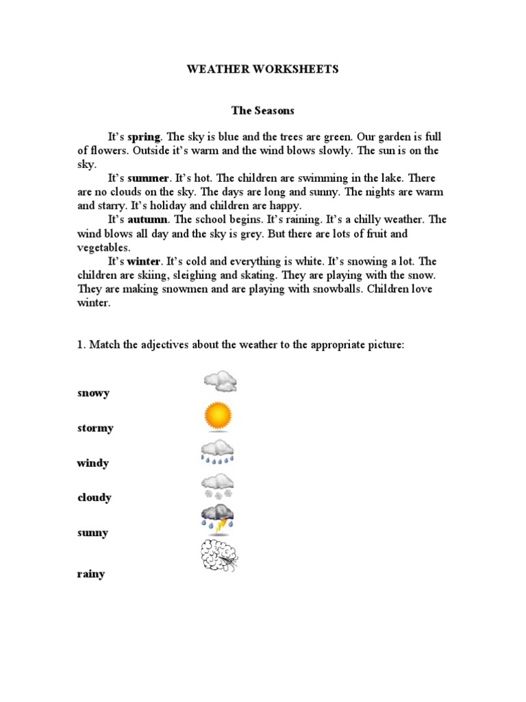 Browse Printable Weather & Season Worksheets - Education Besides the basics, such as learning which months fall in which seasons, our weather and seasons worksheets explain forecasting, wind, and the water cycle. And with weather-related writing prompts, clever puzzles, cute coloring pages, and paper doll cut-out exercises there are numerous ways to engage your budding meteorologist.